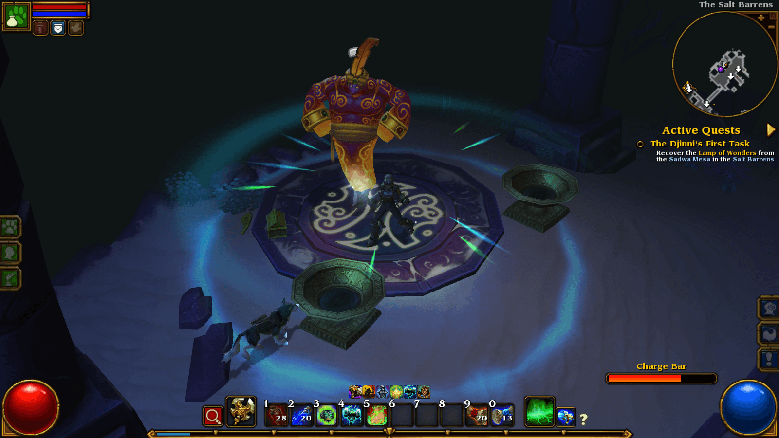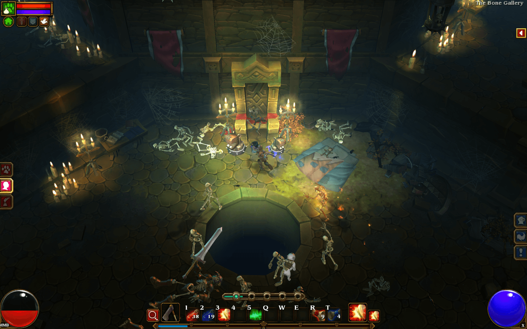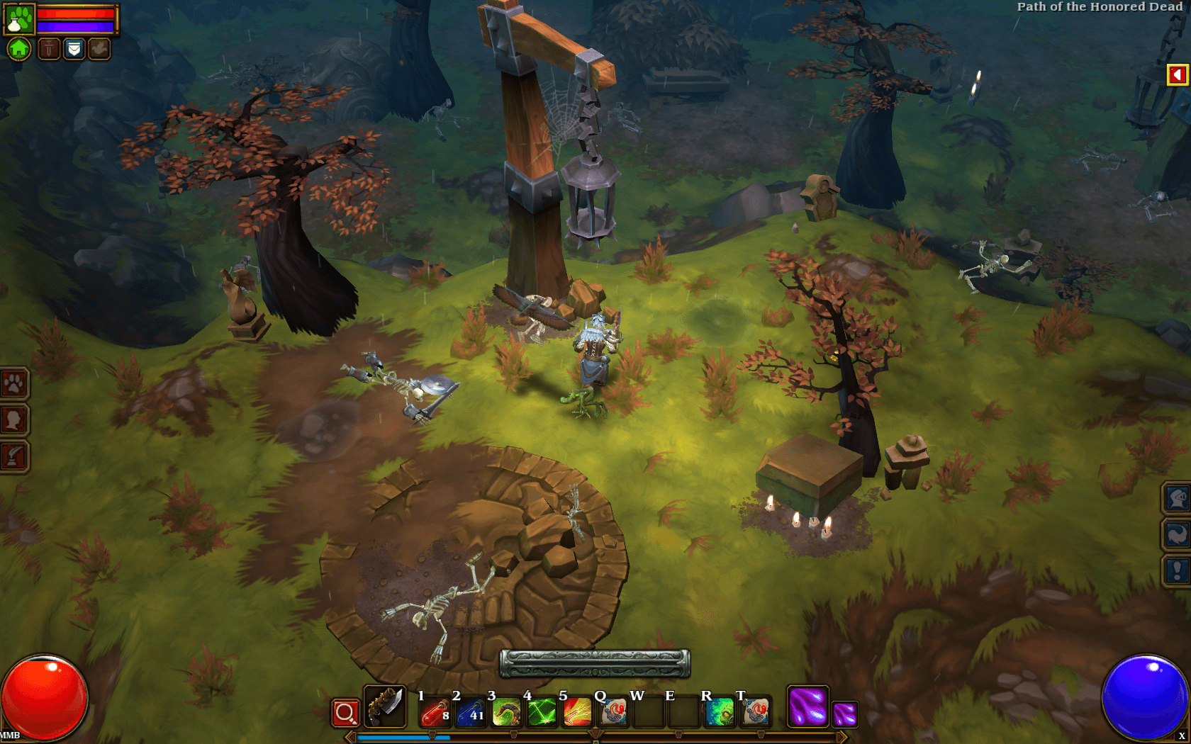 Control-wise Torchlight is pretty straightforward. Your left mouse button can be assigned either the default attacks for your equipped weapons, or a specific skill. The right mouse button can be assigned two skills (and pressing a key switches between them.) Then each of numbers 1-0 on the keyboard may be assigned their own skill or item as well. Thankfully Runic assigned individual keys on the keyboard for using your best health and mana potions, so that frees up your skill bar during gameplay.