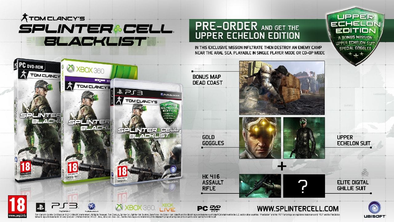 Today, Ubisoft announced details of the Tom Clancy’s Splinter Cell Blacklist Collectors Editions, available exclusively in EMEA territories for the Xbox 360, PlayStation 3 and Windows PC. There will be four different special edition, The 5th Freedom Edition, The 5th Freedom Silver Edition, The Ultimatum Edition and the Upper Echelon Day 1 Edition.